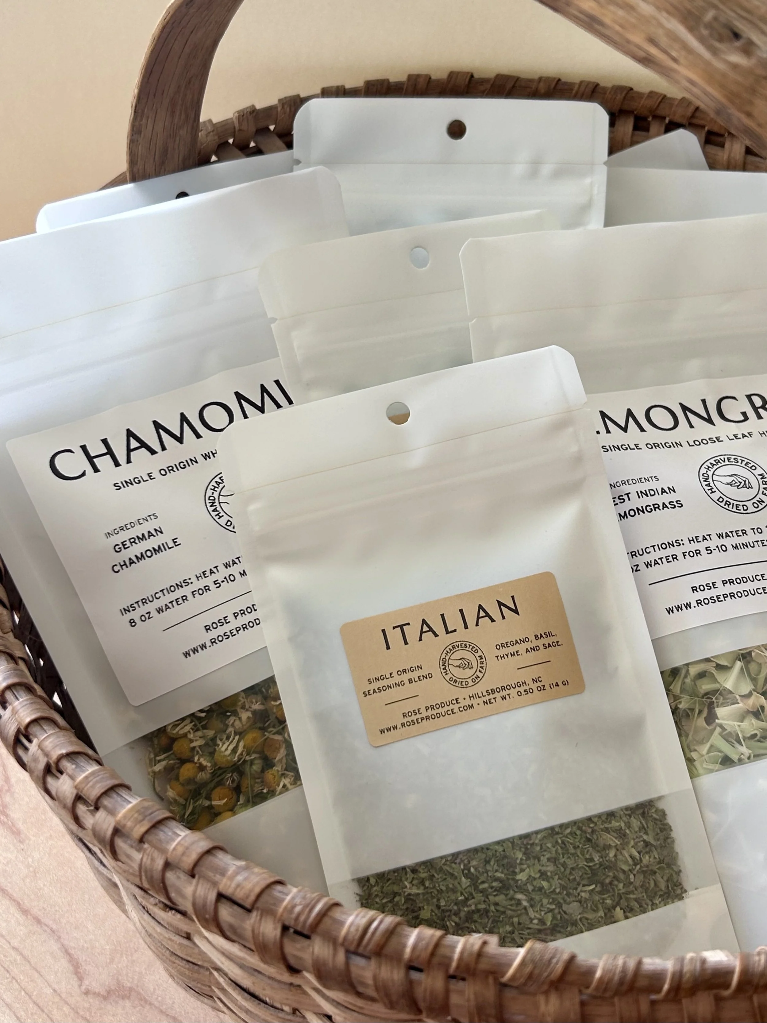 Many of the medicinal herbs we grow are only available to wholesale bulk customers, and our herb club members. At the market, we primarily offer culinary herbs in quantities that are much smaller than what members receive. Herb club shares also include the individual packaging and labeling of each herb in your share.